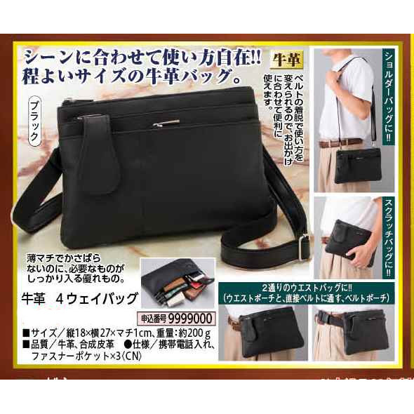 商品名 牛革4WAYバッグ 仕様 サイズ(約)縦18×横27×マチ1cm 材質:牛革、合成皮革(付属) 重さ:(約)200g 原産国:中国 マグホックポケット(スマホケース)、ファスナーポケット×3 説明 使い方はあなた次第のマルチバッグ 肩からかけてショルダーバッグ、腰に回してウエストポーチ、ベルトに通してベルトポーチ、そのまま持ってクラッチバッグとあなた次第で形を変えるマルチバッグ。