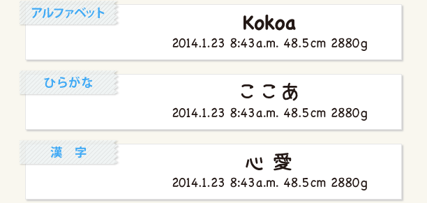 手形足形とお名前はもちろん、生年月日、誕生時刻、身長、体重も入って、オリジナル感満点のフレームになっています。
