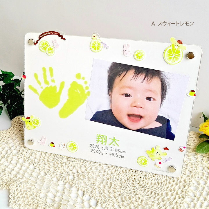 おおでゆかこ × ポムポムプリン ベビーフォトフレーム 手形足形キット付き 名入れ / 漢字名入れ スウィートレモン おかしのおうち 出産祝い 内祝 誕生記念 ベビー 生年月日 / 誕生日 生まれた時間 / 時刻 / 体重 / 身長 も入れられます フォトスタンド 写真立て サンリオ